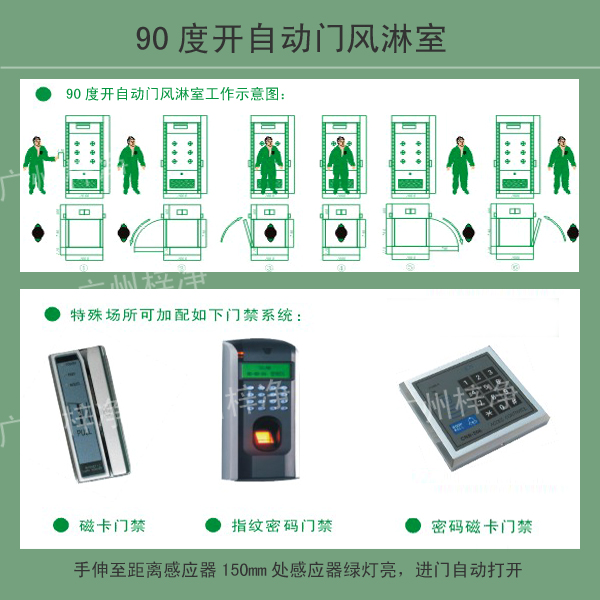 6.镜光不锈钢门上带自动闭门器;电子互锁,风淋时各门自动锁闭,吹淋后入门锁闭,只能从出门走出风淋室;