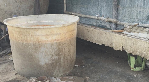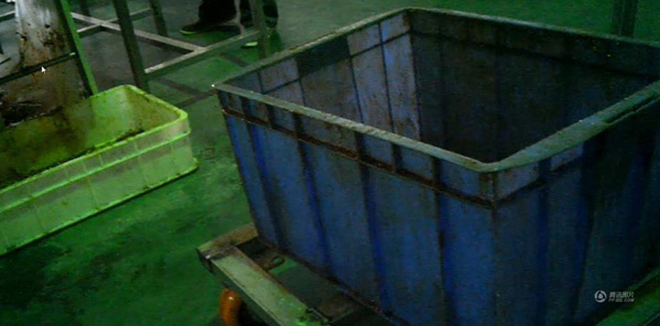 位于河南省通许县工业园的开封劲松食品有限公司生产厂房内,运送辣条的蓝色塑料箱上面布满黑色的污物和油渍(3月7 日摄 视频截图)。