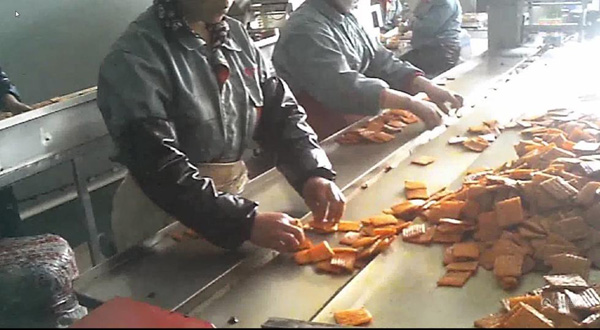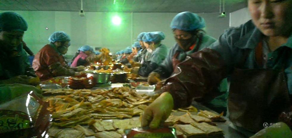 人们不禁担心,“辣条”卫生吗?图为位于河南省通许县工业园的开封劲松食品有限公司生产厂房内,工人直接用手将辣条一块块装入塑料包装袋(3月7日摄 视频截图)。