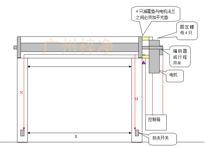 2、装卷轴:(要求镙丝垫片按说明装,联接牢固)装卷轴抬起分别与M、N门框相连接;