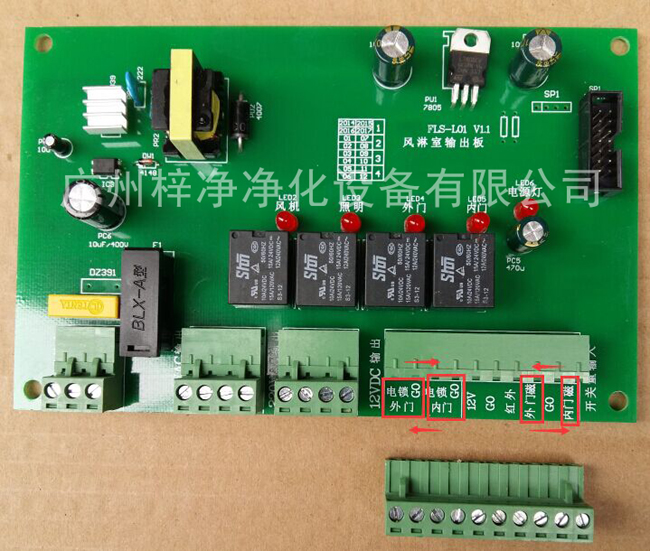 第二种方法:拆开风淋室控制器那块检修板找到风淋室副板如下图,把风淋室的前后门锁及前后门磁线互换一下就可以了。