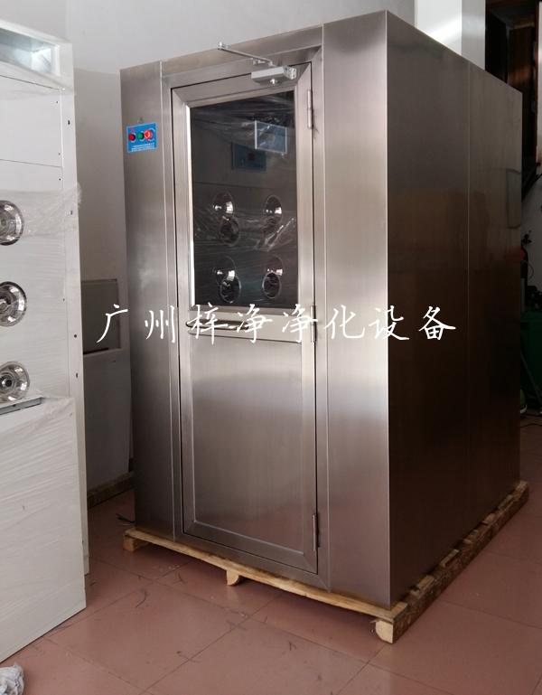 7、配2台大风量风淋室专用风机,功率:0.75KW/台,确保吹淋效果,风速≥22-25m/s, 双侧吹淋,配24个不锈钢喷嘴。