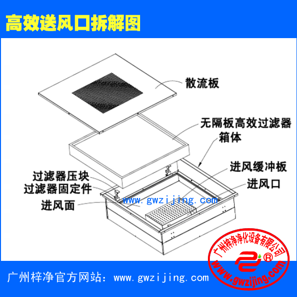 超薄高效送风口为千级、万级、十万级净化空调系统较为理想的终端过滤装置,超薄高效送风口可广泛用于医药、卫生、电子、化工等行业的净化空调系统。超薄高效送风口是用作改造和新建1000—300000级各级洁净室的终端过滤装置,是满足净化要求的关键设备。超薄高效送风口包含静压箱,散流板,高效过滤器。