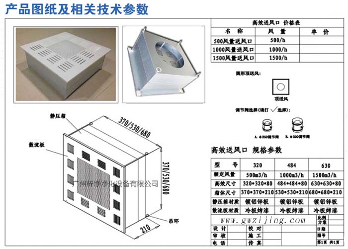 1、一套高效送风口含法兰、静压箱体、散流板、高效过滤器四件套,散流板采用冷轧钢板烤漆制作,静压箱体采用镀铝锌板制作,法兰及调节阀采用镀锌板制作;