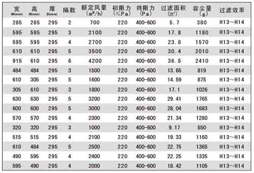 隔板:波纹形铝箔隔板或纸隔板可以精确地保持褶层间距在最小阻力下,最大限度地用滤料在腐蚀性环境中,可使用镀乙烯隔板、隔板边缘斩折,可防止滤料破损、铝箔厚度0.03mm,波纹高度4mm,可以充分保障过滤材料的面积及过滤器的轻质量。