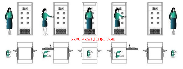 2) 进门程序: 穿好防静电洁净服→打开前门,人员/货物进入→风/货淋室开始吹淋,风速高达25m/s以上,(风淋室:人在风淋区域中左右侧身各数次,让全身完全处于风淋中)此时电锁工作,前后门都不能打开→风/货淋室经过15秒风淋后自动停止(风淋时间出厂时由厂家初始设定为15秒,也可由用户自行设定)此时前门电锁工作,人员/货物不允许从前门退出→打开后门,人员/货物出去→进门过程结束。