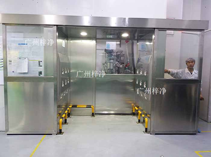 自动门风淋室与自动门货淋室并设有光电感应器,单向通道风淋室,从非洁净区进入,关门后红外线感应有人就吹淋,吹淋后入门锁闭,只能从出门走出风淋室;
