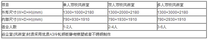 风淋室是人进入洁净室所必需的通道,它可以减少进出洁净室所带来的污染问题,减少由于人货进出带来的大量尘埃粒子由洁净室的入口处安装功能齐全的“气闸室”可以减少空气污染微粒的数量,当人货通过风淋室时,污染微粒被经过高效过滤的高度洁净空气射掉,25m/s以上的高风速确保了有效的喷射和飘移微粒经过初效和高效两级过滤器基本过滤掉。为了保持风淋的安全使用,维持洁净室环境的洁净度
