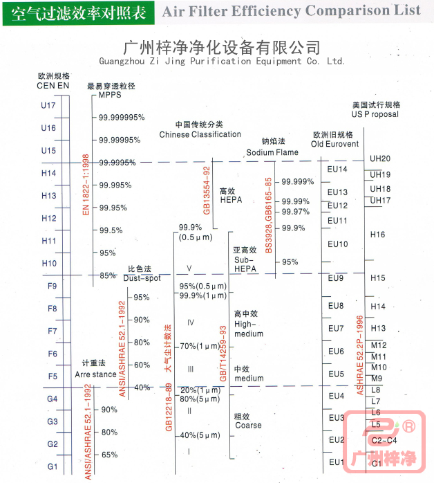 空气过滤器效率对照表分为欧洲规格、中国传统分类、欧洲旧规格、美国试行规格。