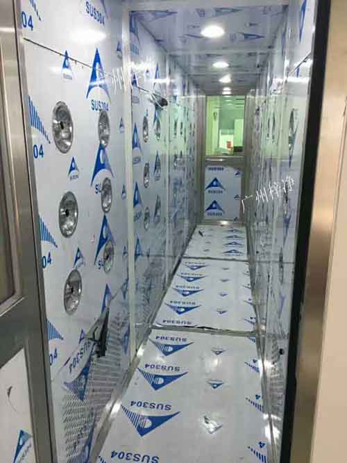 多人风淋通道定义:为了减少由于人员进出所带来的大量尘埃粒子,经高效过滤器过滤后的洁净气流由可旋转喷嘴从各个方向喷射至人身上,有效而迅速清除尘埃粒子,清除后的尘埃粒子再由初、高效过滤器过滤后重新循环到风淋区域内。