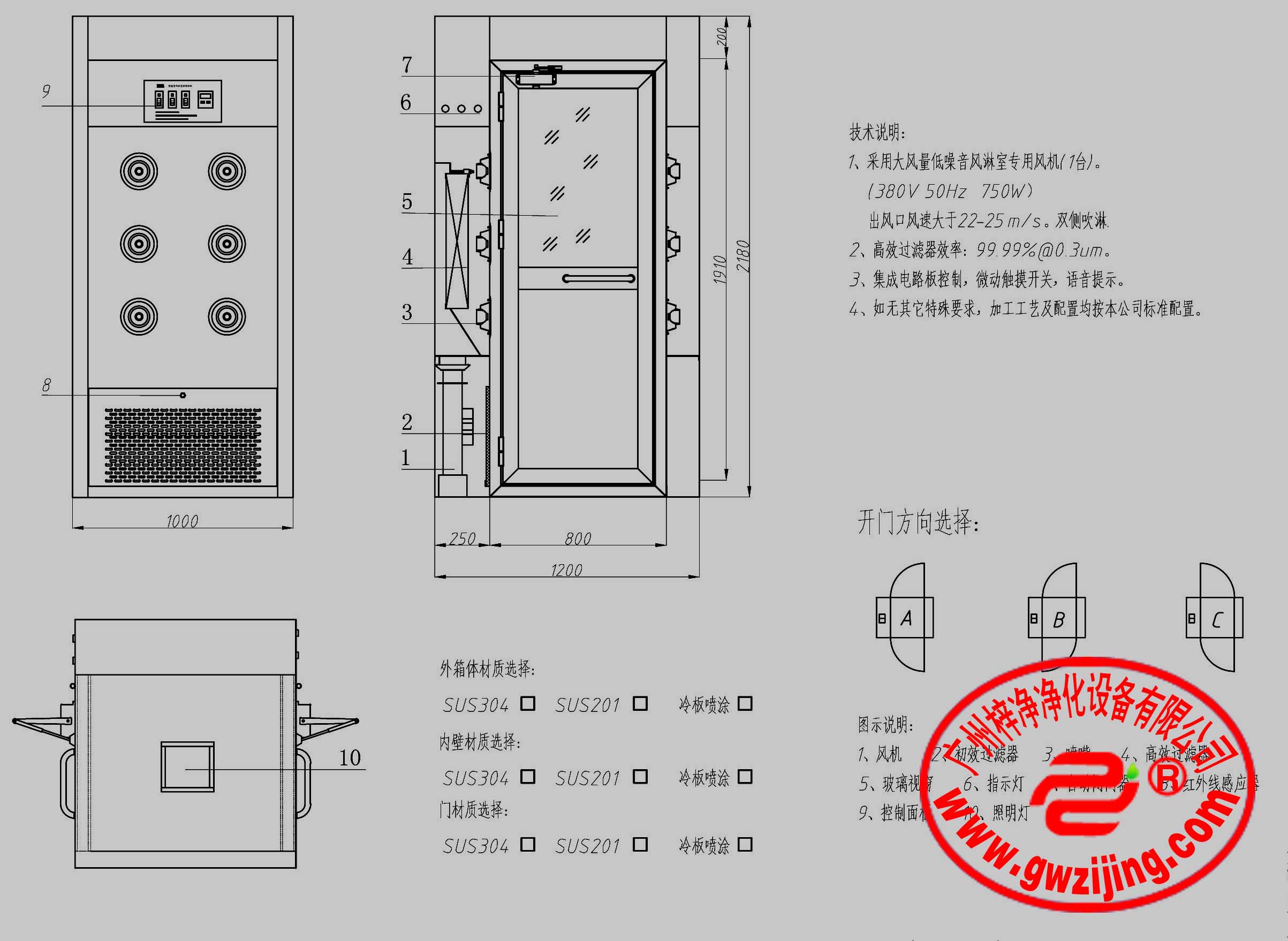>>电源:380V 50Hz(可为客户非标私人定制110V,460V,60Hz等非标电压频率风淋室)
