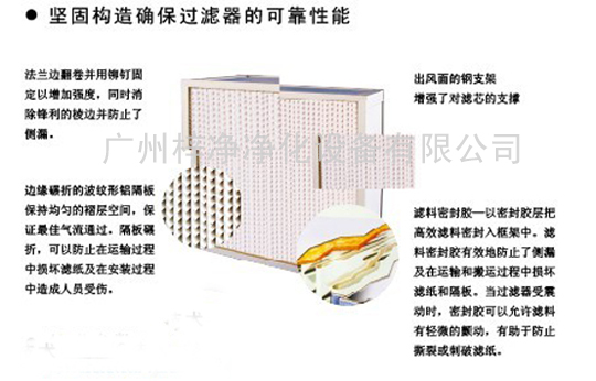 滤料超细玻纤滤纸、密封胶 PU双组份聚氨酯胶,框体 铝型材、铝板、镀锌板、不锈钢、木框分隔物 120g/┫胶板纸或0.035mm厚铝箔,密封胶条 PU聚氨酯发泡胶、EVA、氯丁橡胶、过滤效率 99.99%~99.995% @ 0.3μm使用最高温度 80℃;使用最高湿度 80%;铝型材可选厚度 120~220mm