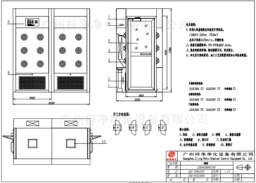 2、人性化操作:人性化的控制面板设计,清晰的指示灯指示及语音提示,给予用户清晰正确的风淋流程指示。软键触按式时间继电器,LED显示及设置吹淋时间,可调范围在10-99s,用户可根据风淋室外部环境的差异调节吹淋时间。
