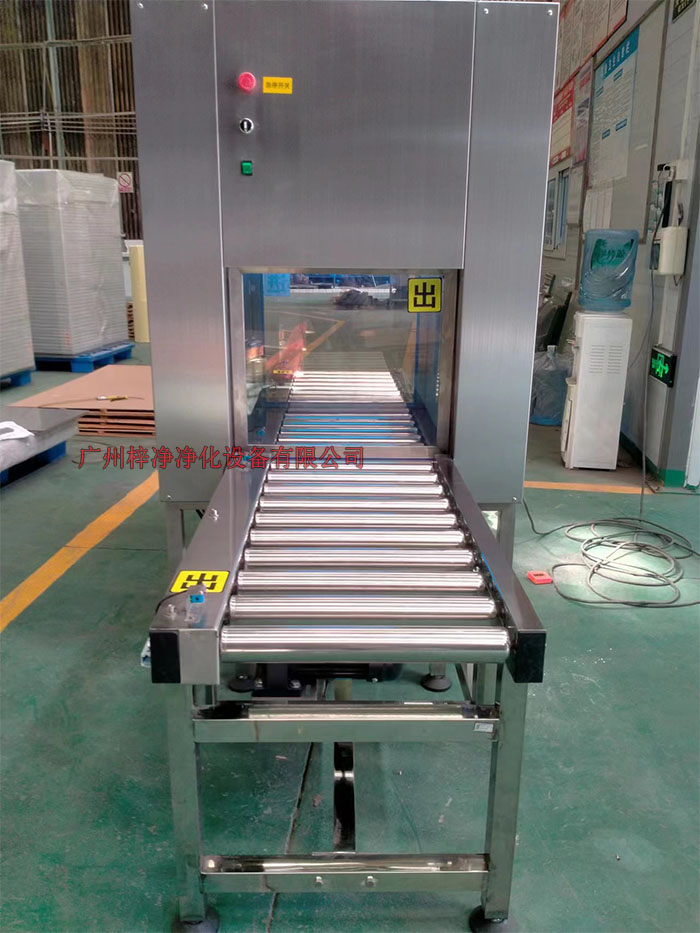 输送带传递窗在传递物料时,顶部吹出高速、洁净气流,吹除货物表面的尘粒,此时,两侧门可以打开也可关闭,洁净气流起到气闸作用,以保证洁净室室外的空气不会影响室内的洁净度。