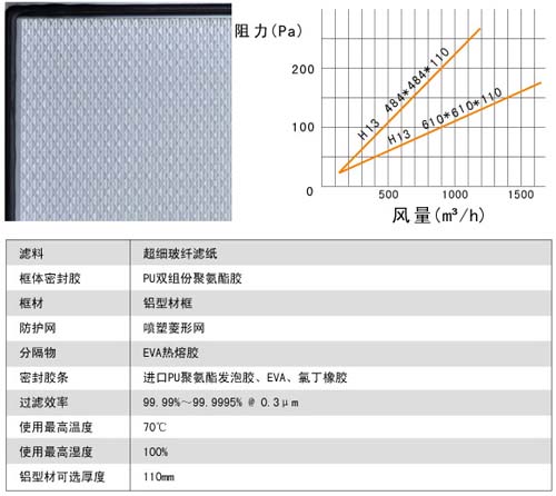 过滤效率:H13:99.97-99.99%@0.3μm H14:99.995-99.999%@0.3μm。