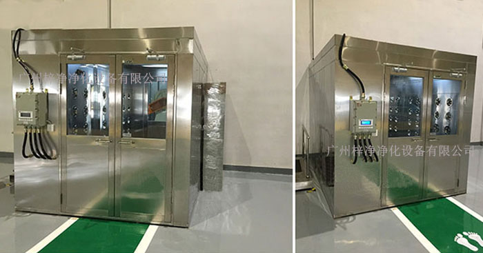 防爆风淋室是人/货进入洁净室所必需的通道,为了减少由于人/货进出带来的大量尘埃粒子,在洁净室的入口处安装功能齐全的“气闸室”可以减少空气污染微粒的数量,当人/货通过风淋室时,污染微粒被经过高效过滤器的高度洁净空气射掉,25m/s以上的高风速确保了有效的喷射和飘移微粒经过初效和高效两级过滤器基本过滤掉。