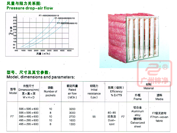 玻璃纤维袋式中效过滤器分别为F7级玻璃纤维袋式中效过滤器和F8级玻璃纤维袋式中效过滤器。