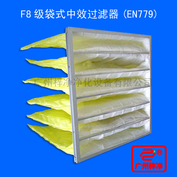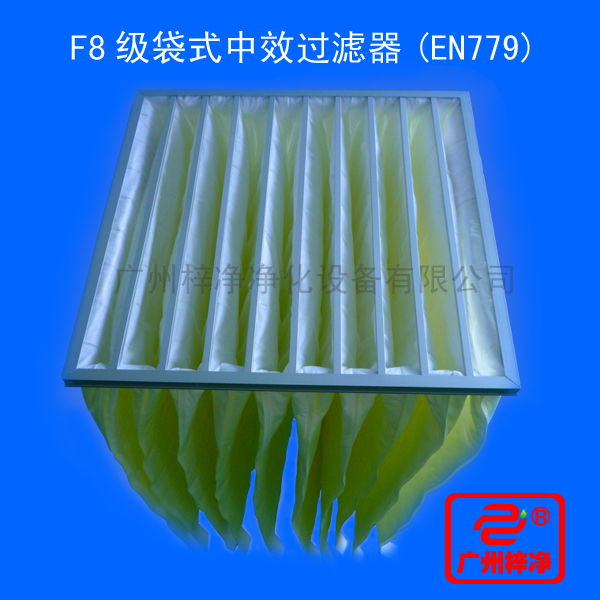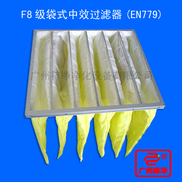 F8级袋式中效过滤器采用超细合成纤维以特殊工艺制成,避免旧式玻璃纤维材料可能对人体造成的危害,滤料内含有防静电纤维,对空气尘埃颗粒过滤特别好,具有过滤面积大、吐气性 高、使用寿命长等特点。