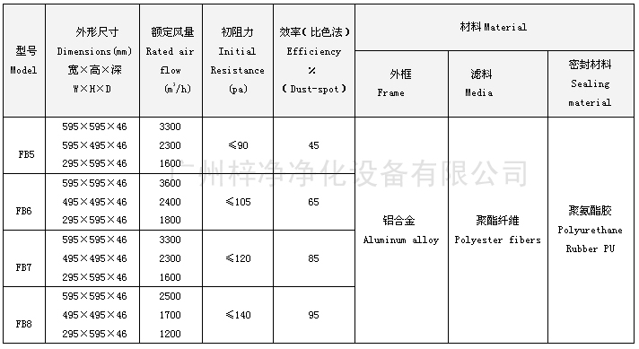 FB板式中效过滤器结构坚固、外框采用铝合金、聚酯纤维滤料、密封胶为聚氨酯胶PU。